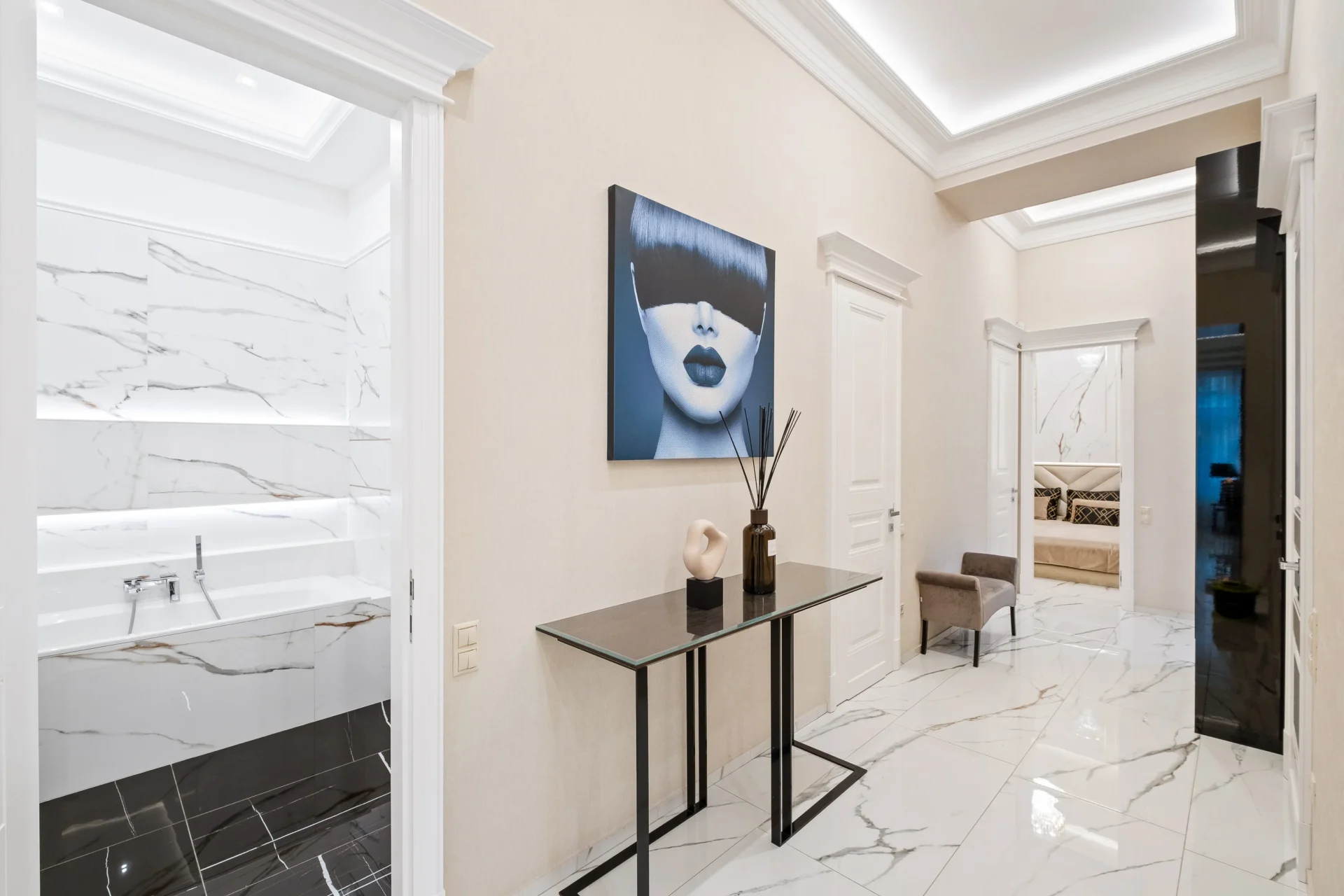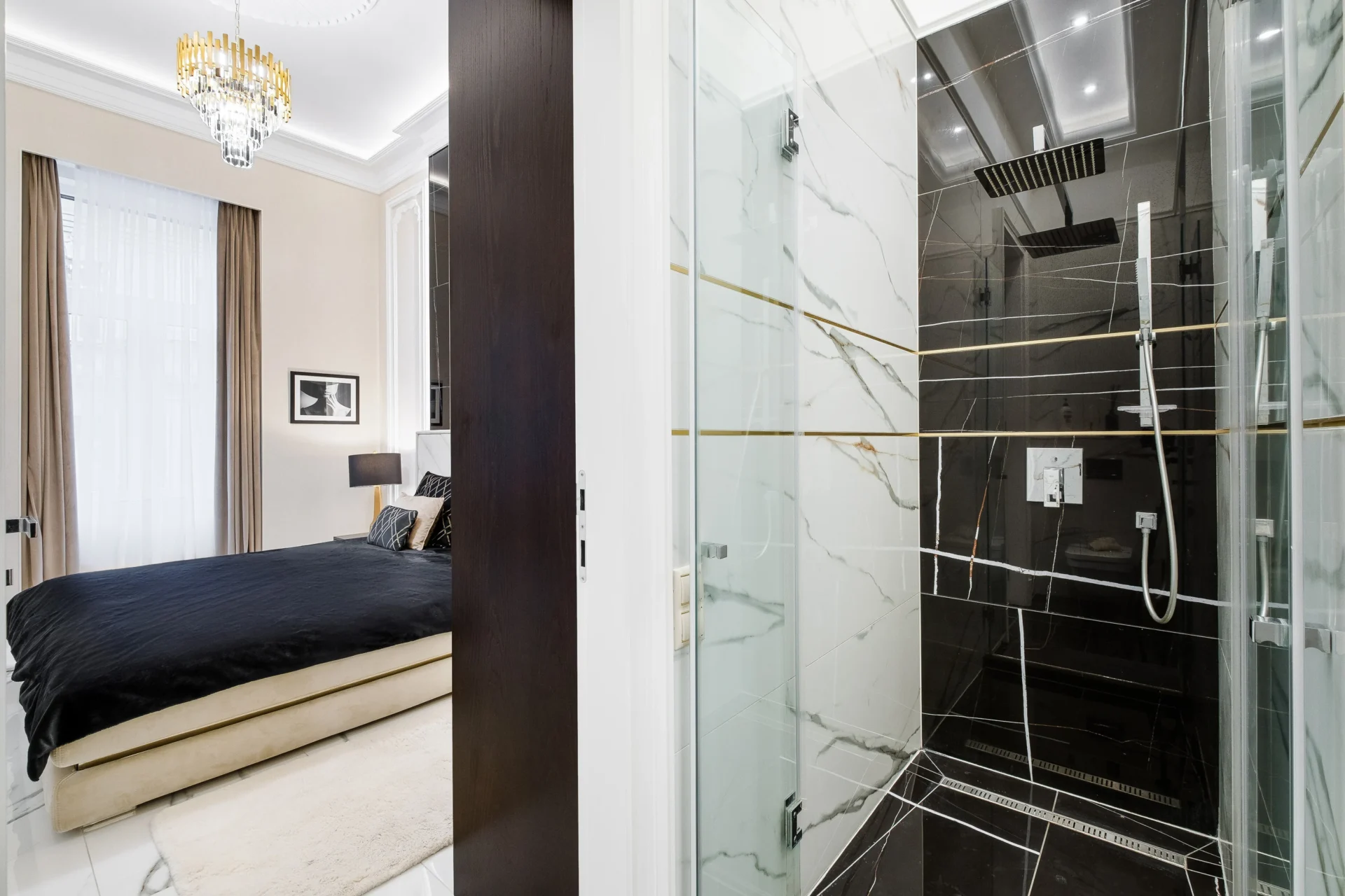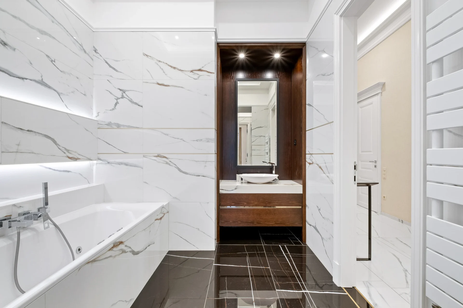 Luxuskivitelű tapéták, márvány burkolatok, és padlófűtés biztosítják az otthon eleganciáját