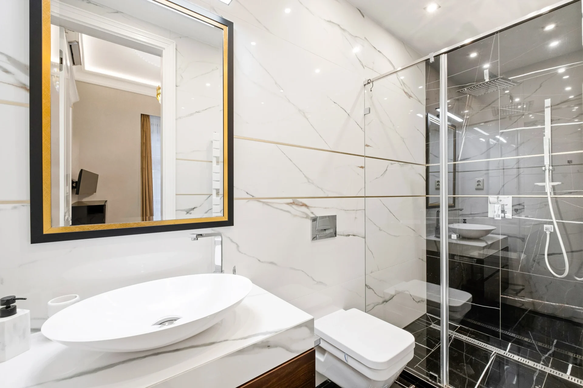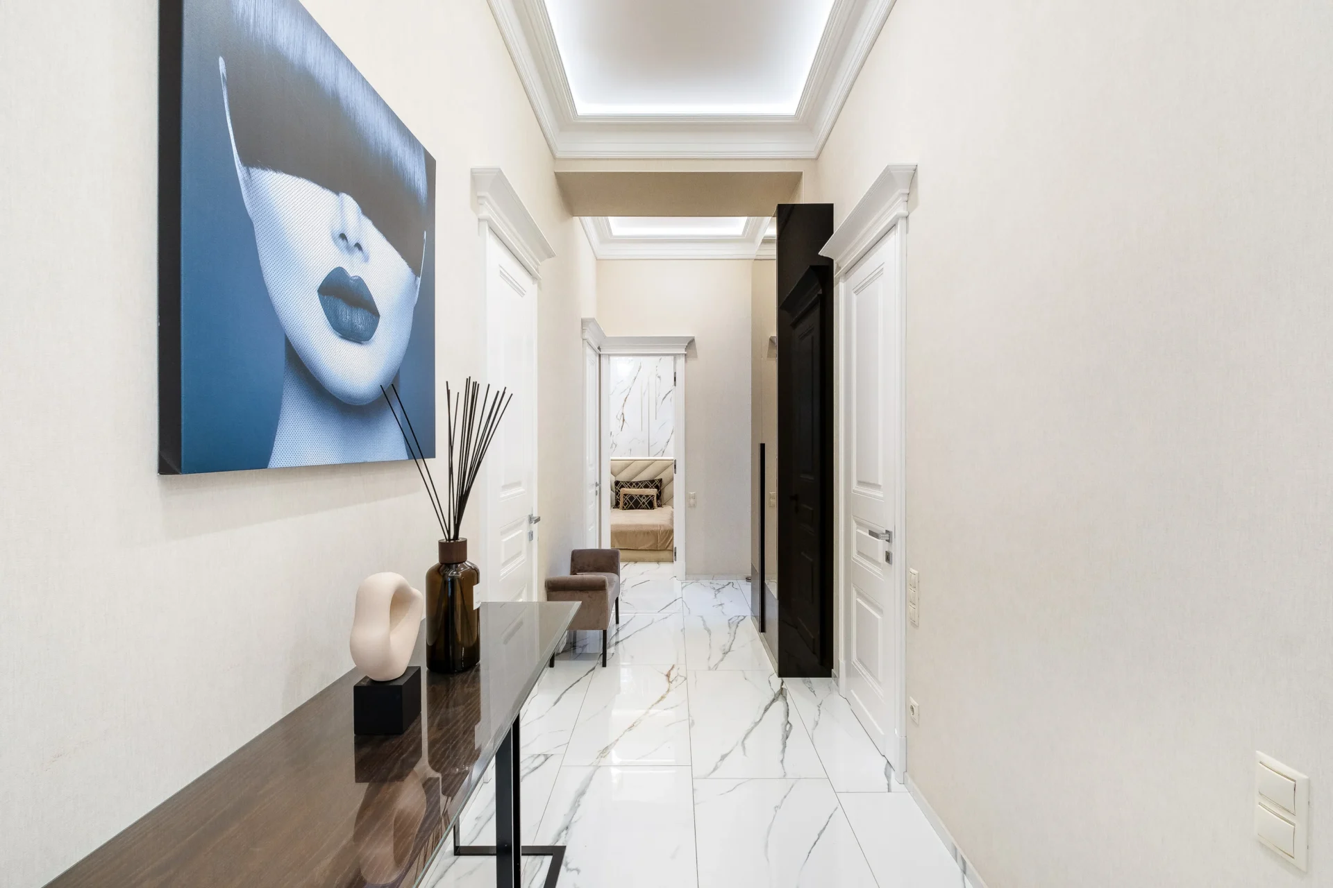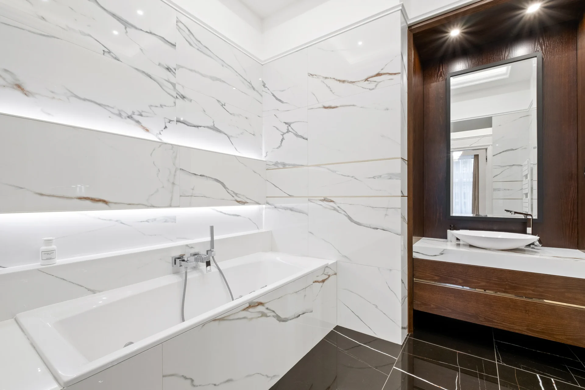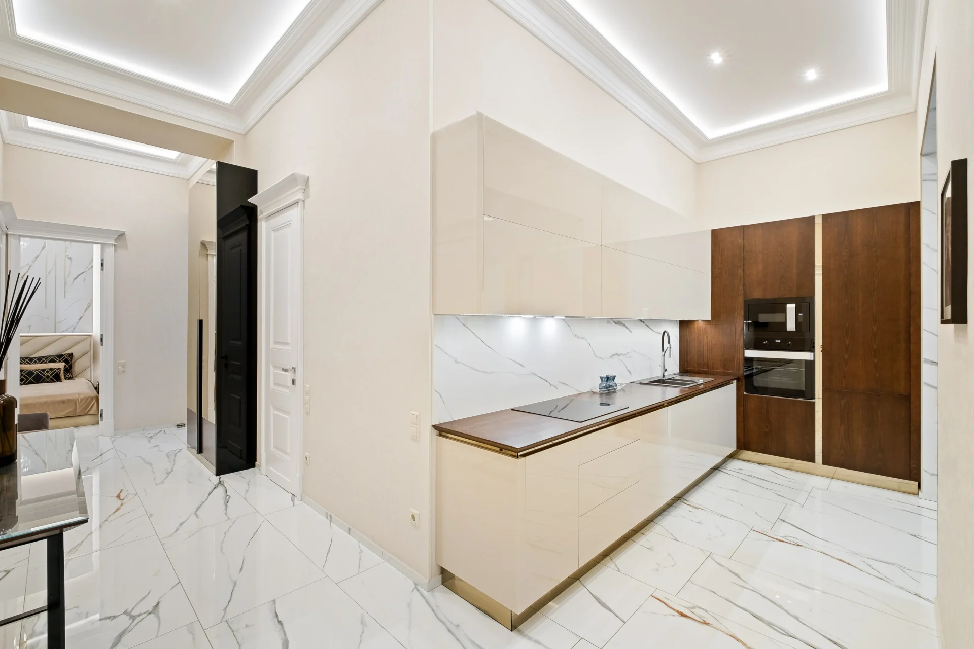 Luxuskivitelű tapéták, márvány burkolatok, és padlófűtés biztosítják az otthon eleganciáját