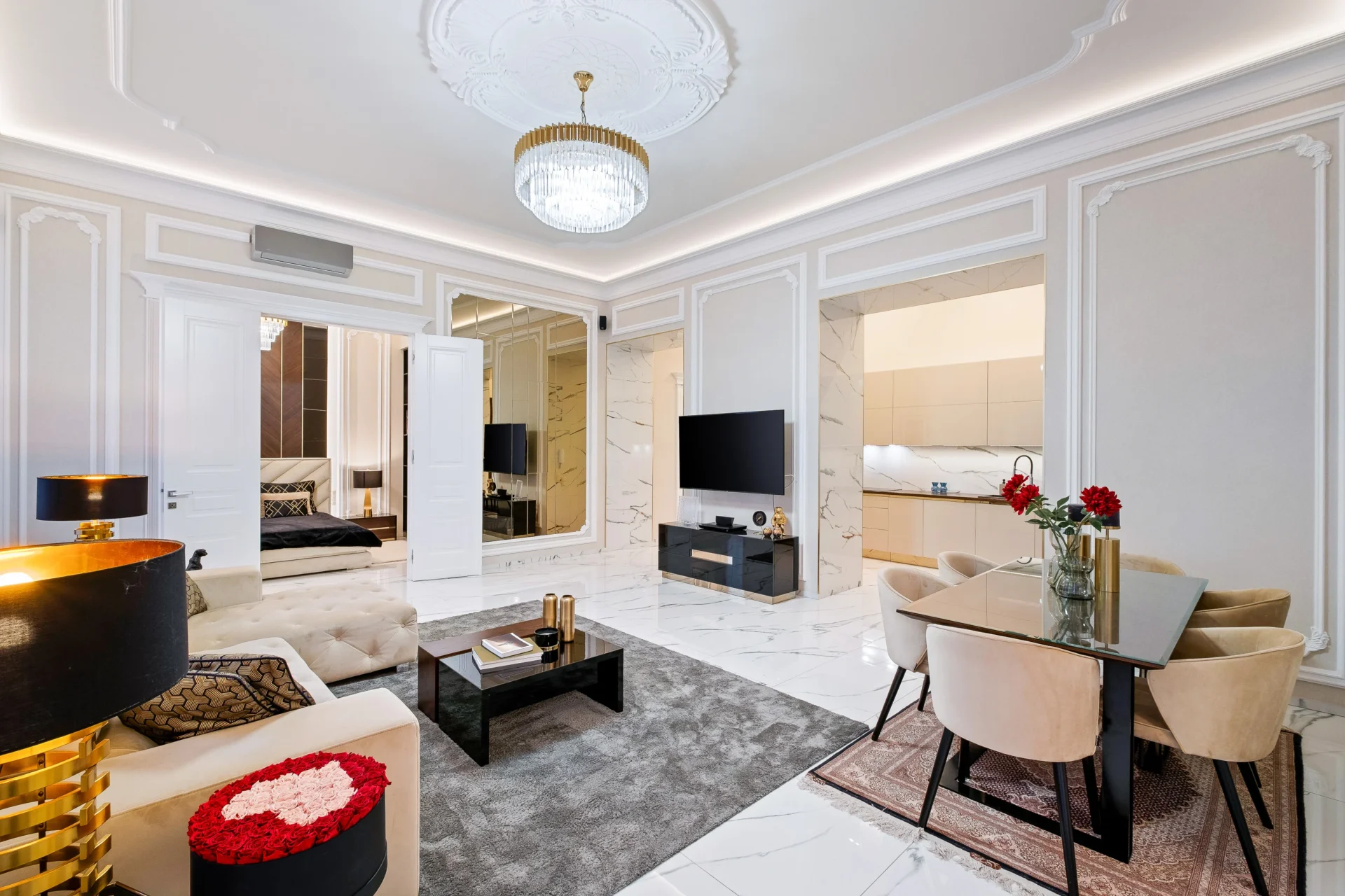 – Stylish living room furniture, a dining table, and chairs that perfectly complement the apartment’s aesthetic.