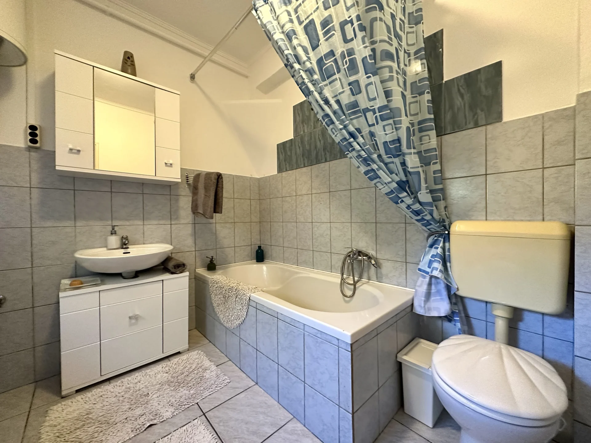 Tovább haladva, a középső élettérben egy hálószobát, egy kádas fürdőszobát toalettel és egy külön álló konyhát találunk, illetve egy kb. 15,5 nm-es télikertet. Fűtését gázkonvektor, a meleg vizet pedig gázbojler szolgáltatja.
