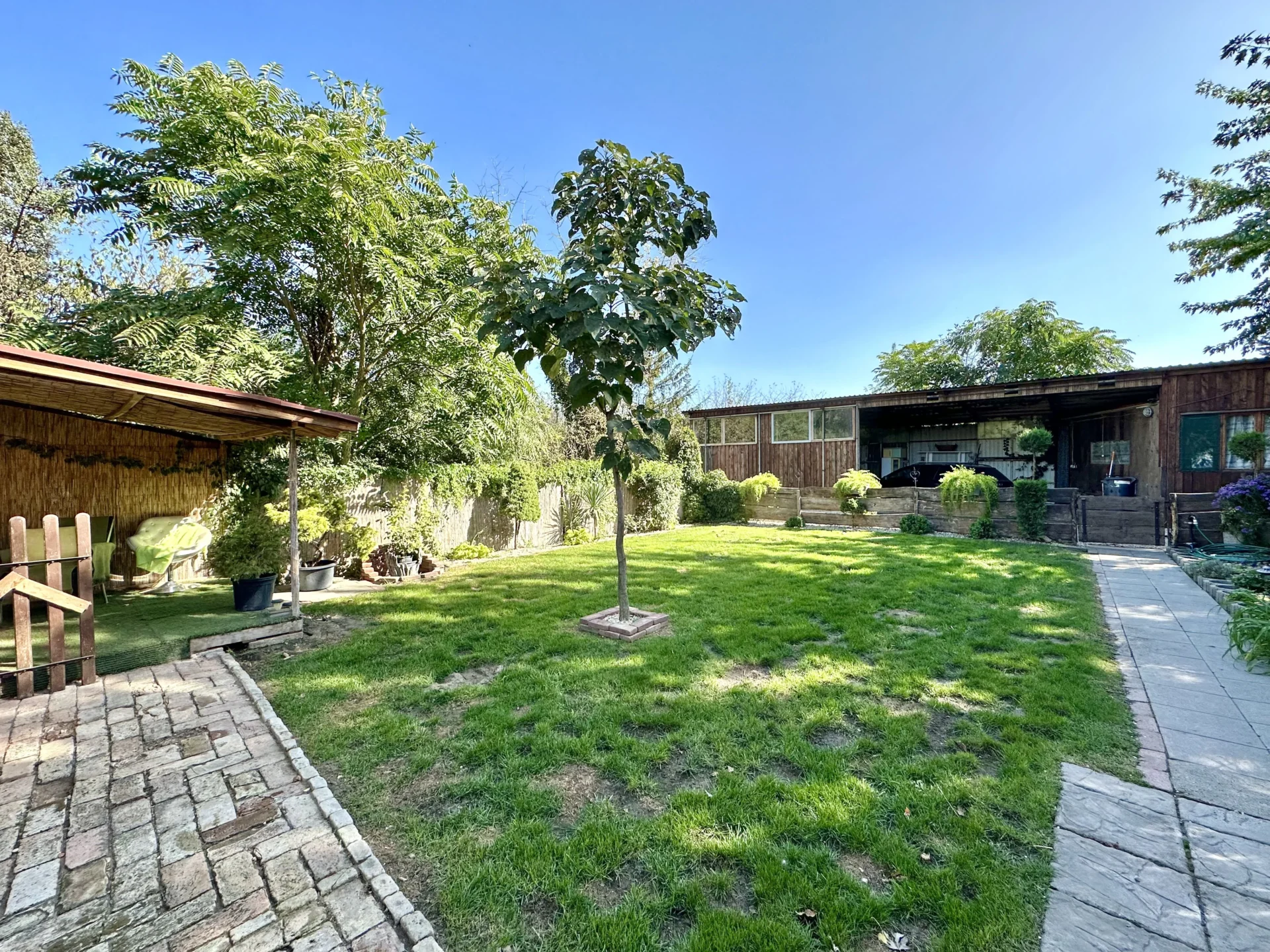 A hatalmas telek kertépítők által megálmodott és kivitelezett, rendszeresen karbantartott. Rengeteg díszfa, cserje, dísznövény, gyümölcsfa tarkítja a kertet, manuális öntözőrendszer, fúrt kút, kerti tároló, fedett autóbeálló, automata kertkapu, grillsarok várja új tulajdonosát.