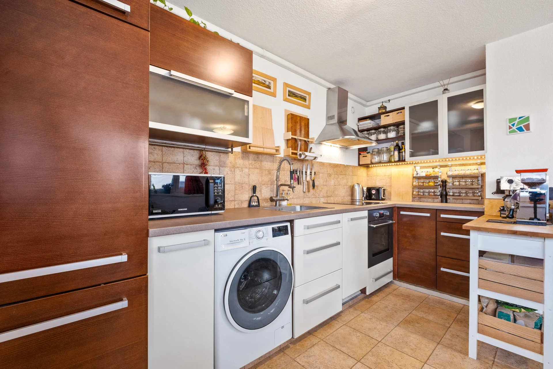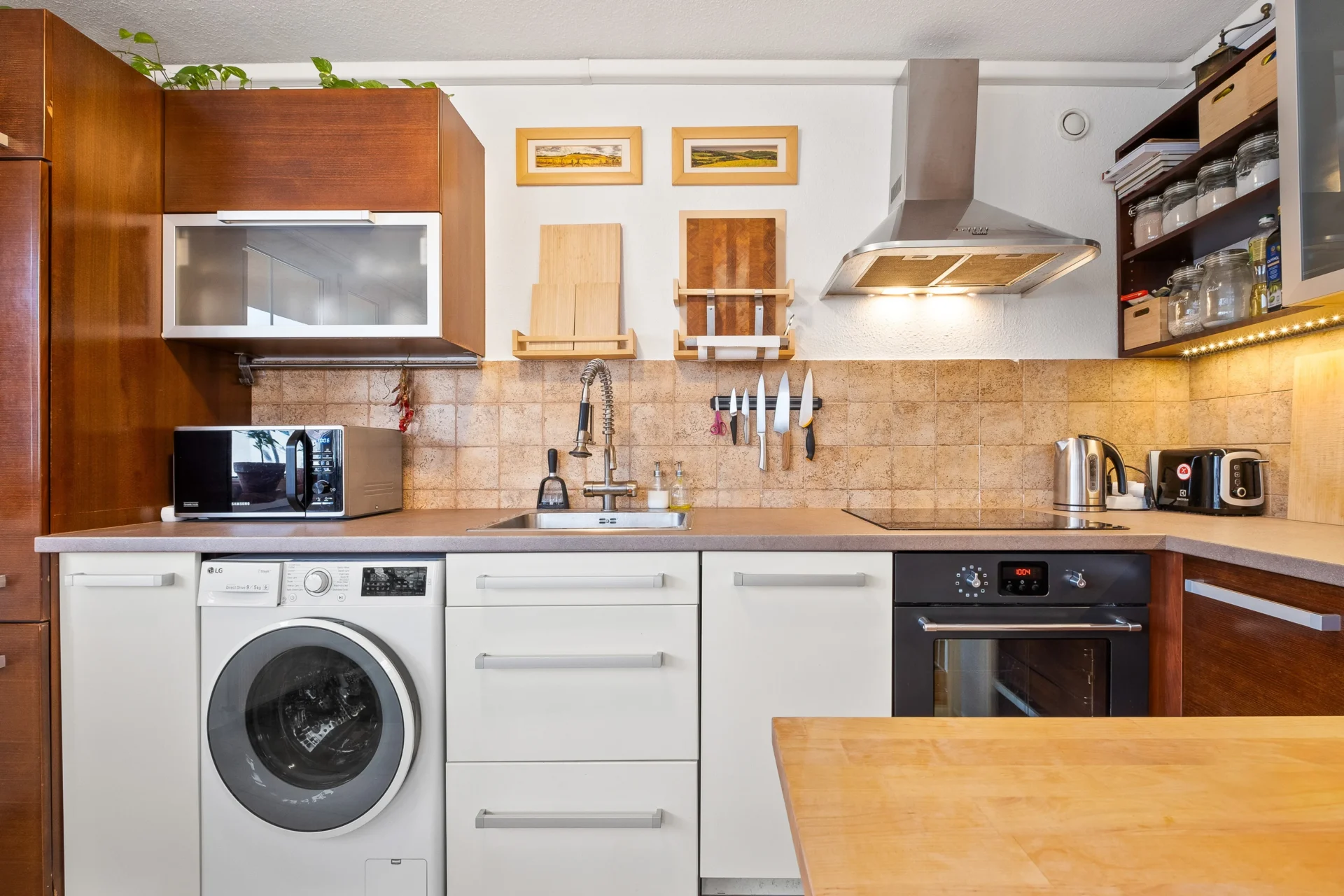 A lakás bútorozott és gépesített, teljesen, felszerelt (mosógép, beépített sütő, főzőlap, mosogatógép stb.).