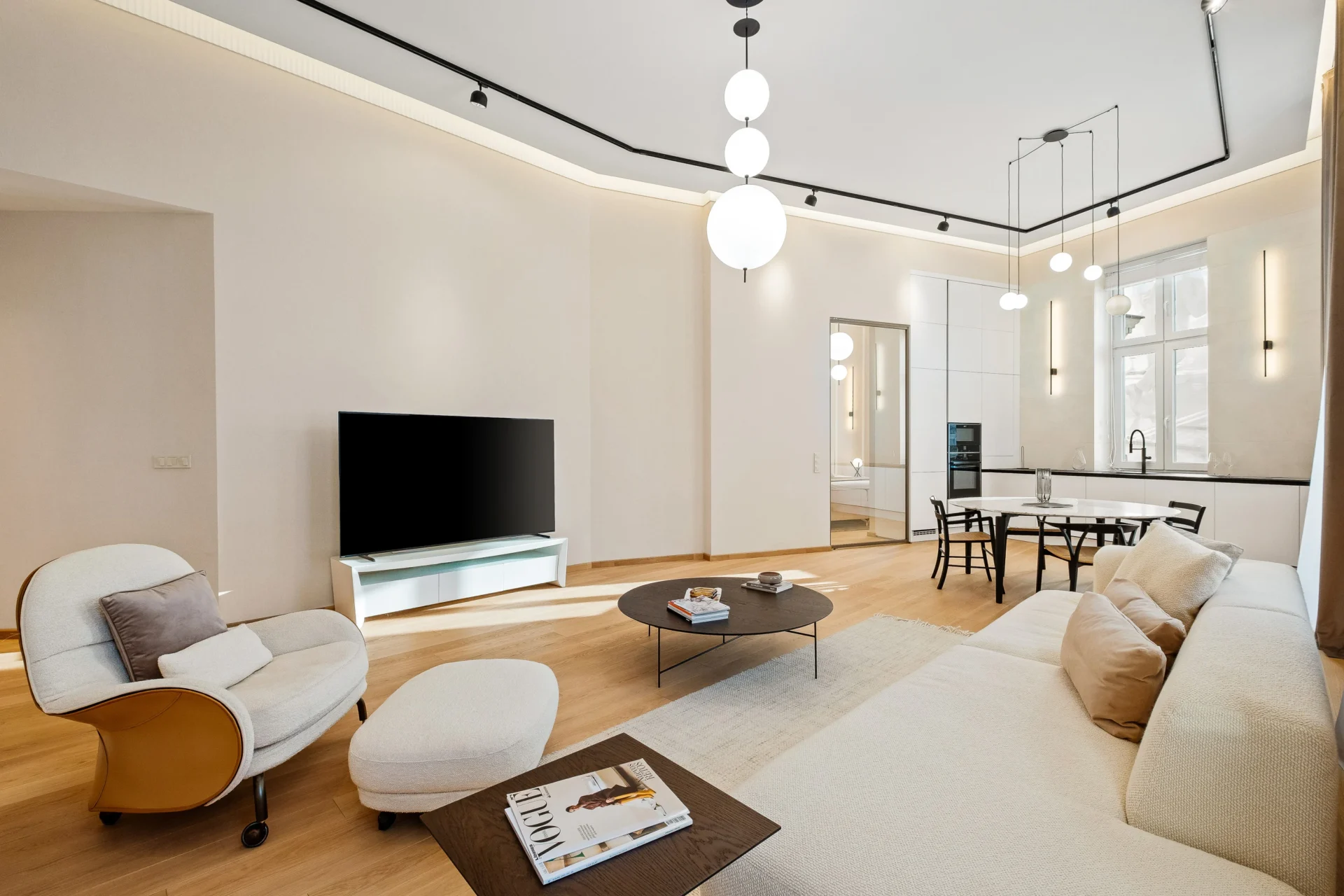 Lenyűgöző, világos amerikai konyhás nappali, amely a legújabb trendeknek megfelelően, a legmagasabb igények szerint lett kialakítva.