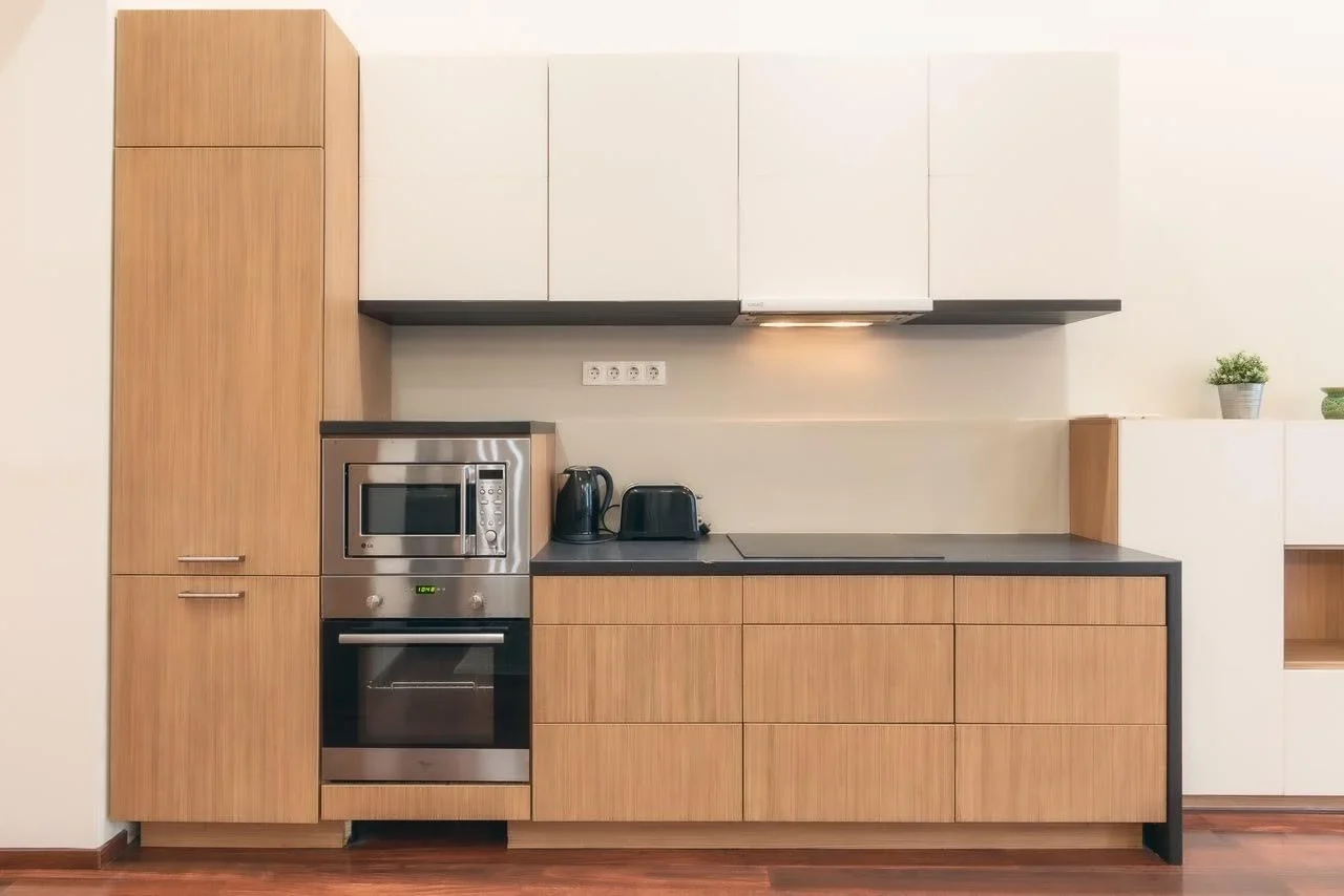 The apartment welcomes you with a spacious hallway and built-in wardrobes, featuring two comfortable bedrooms and two modern bathrooms. The American-style kitchen is a true gem, fully equipped with appliances including a dishwasher, extractor hood, built-in microwave, refrigerator, freezer, and oven.