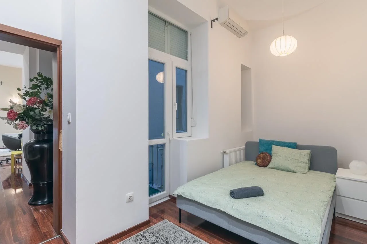 Az ingatlan mindemellett teljesen bútorozott és modern klímaberendezésekkel ellátott, így a nyári hőséget is kényelmesen átvészelheti. Két erkélye közül az egyik utcafronti, míg a másik a csendes belső udvarra néz, tökéletes hely az esti pihenésre vagy a reggeli kávézásra.